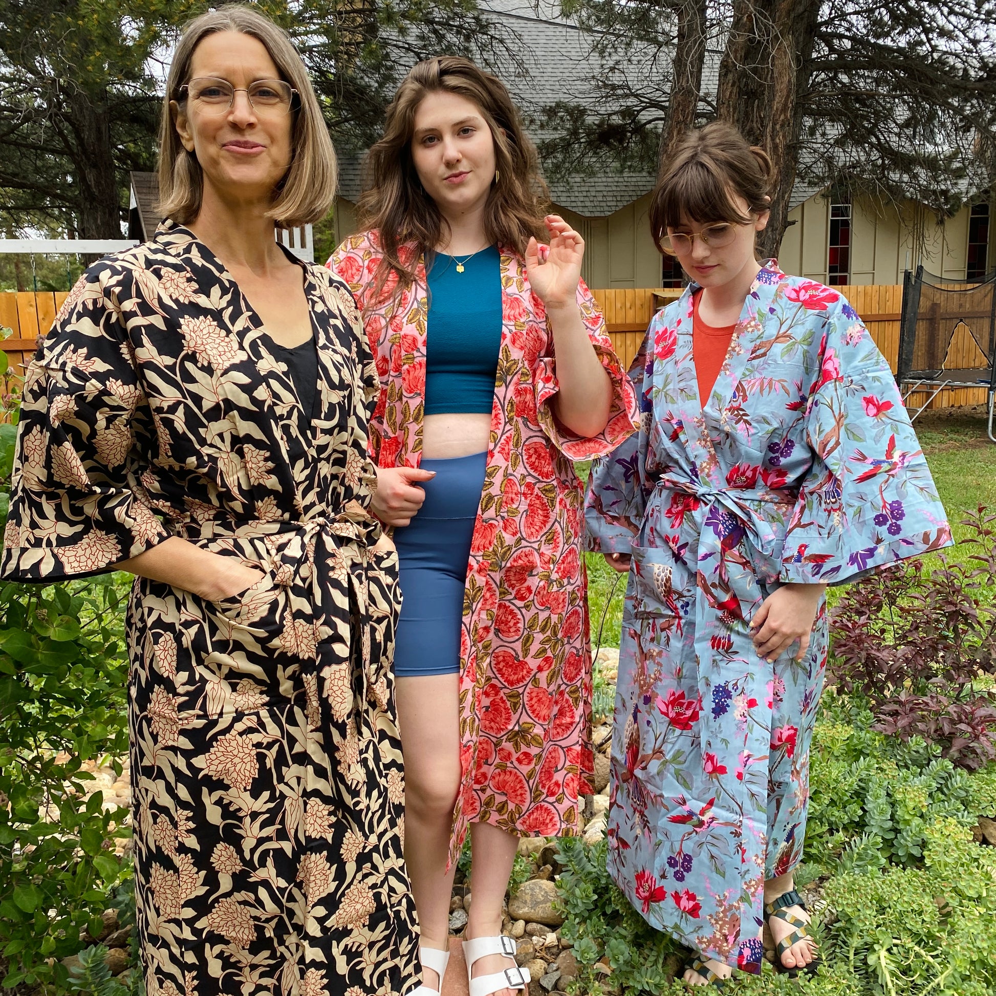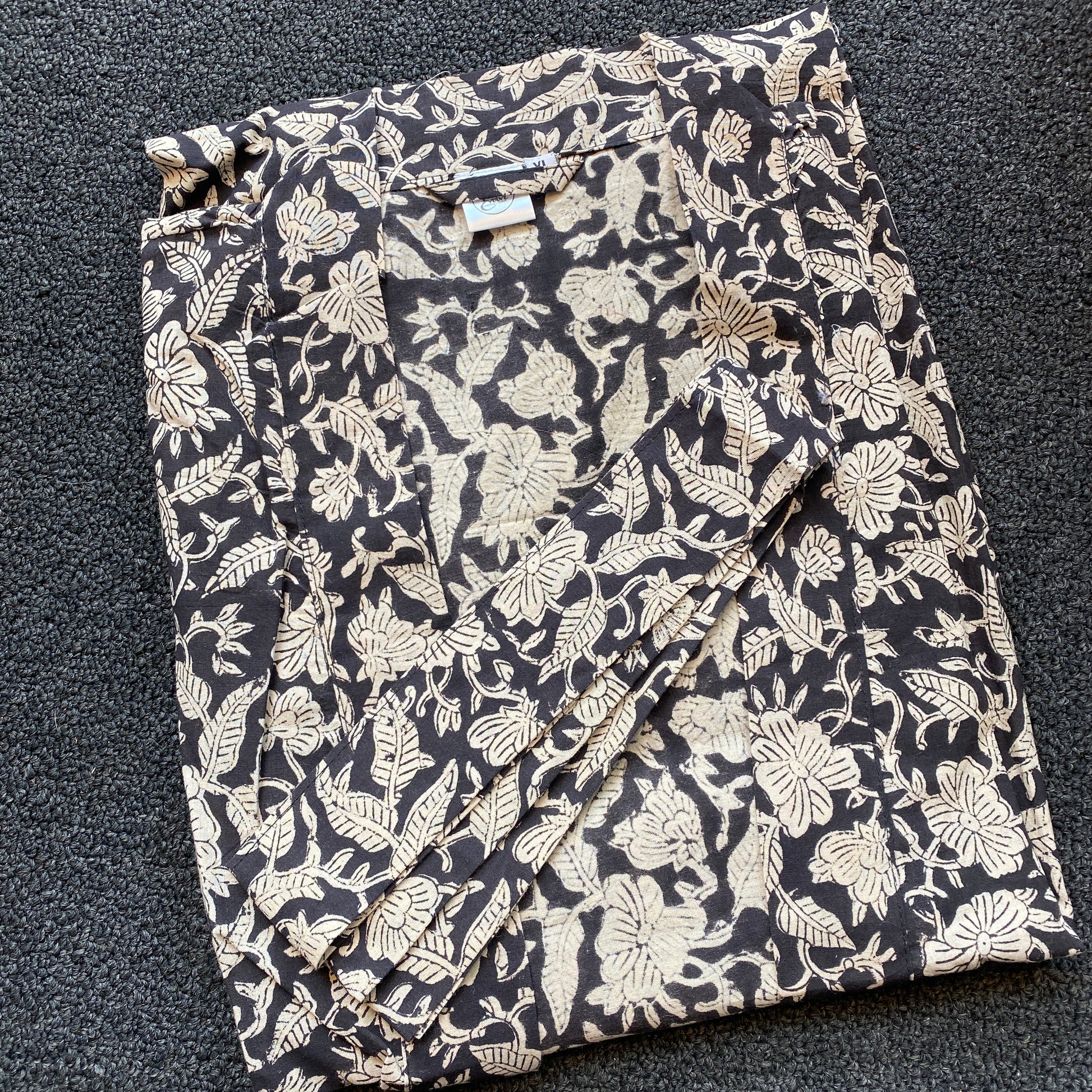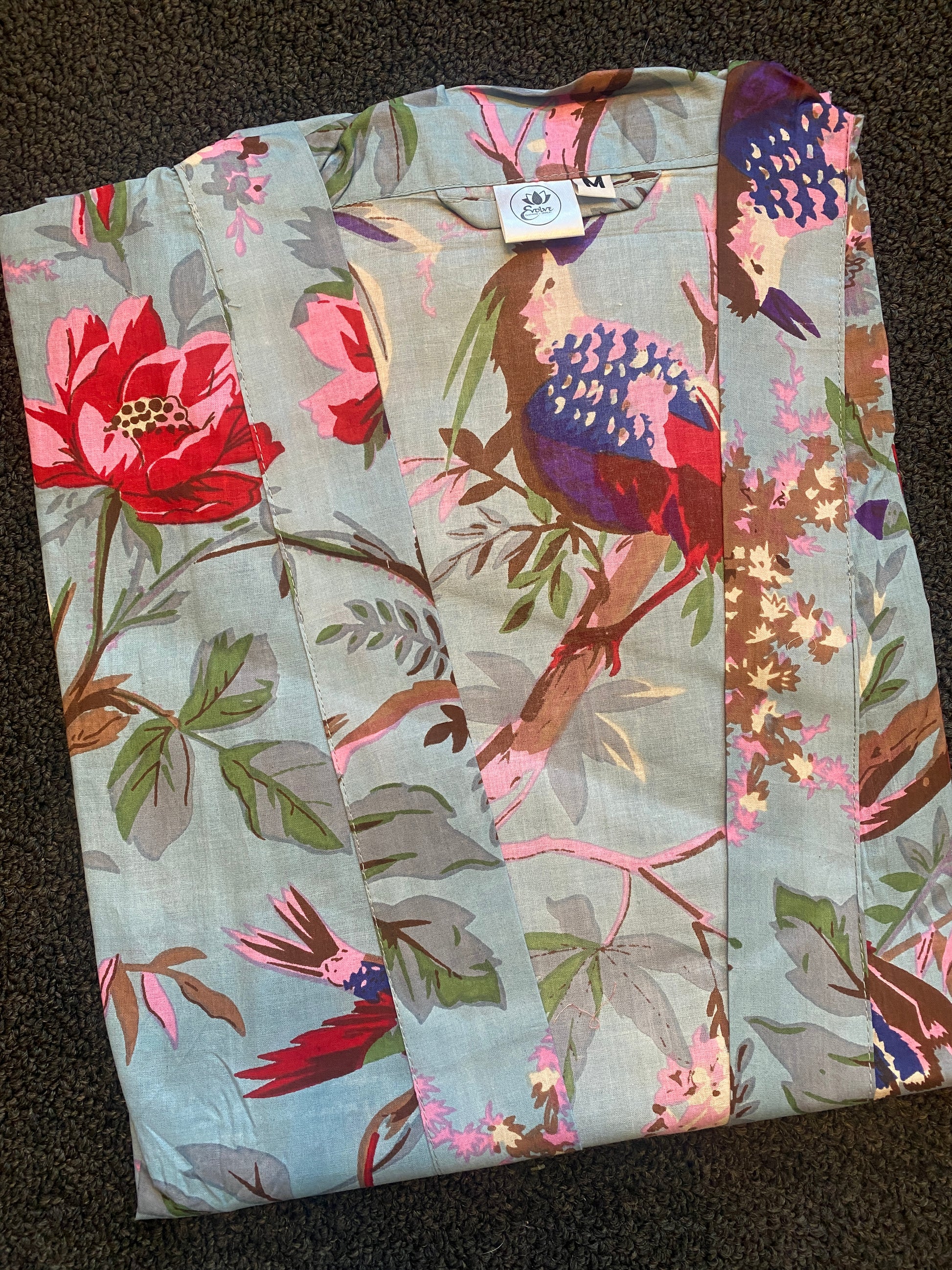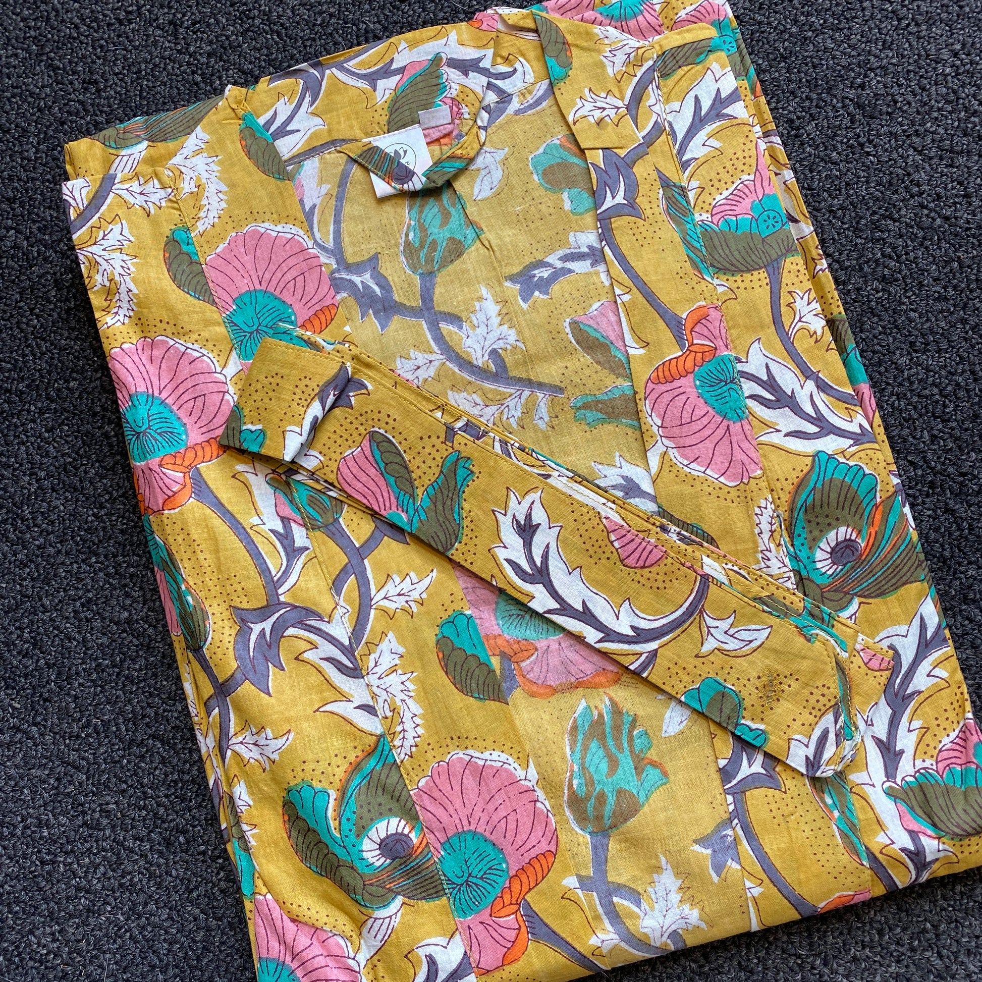 This house robe is 100% cotton and made using the traditional wood-block printing technique. Personally designed and curated by Evolve.